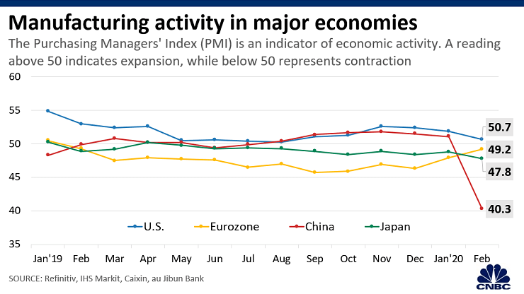 민간 기업에 대한 설문 조사인 Caixin / Markit Manufacturing Purchasing Managers Index는 2월 중국의 공장 활동이 40.3으로 사상 최저 수준인 것으로 나타났습니다. 50 미만의 수치는 수축을 나타냅니다.