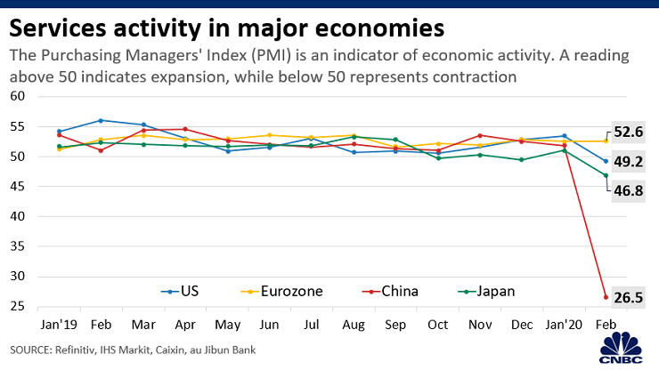 서비스 부문이 약화된 유일한 국가는 중국이 아닙니다. 월간 PMI 데이터를 수집하는 IHS Markit에 따르면, 세계 최대 소비자 시장인 미국의 서비스 부문도 2월 계약을 체결했습니다.